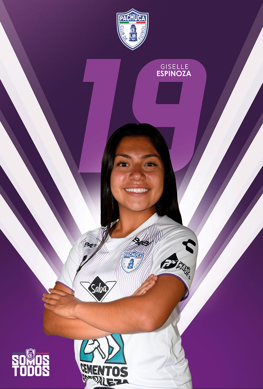 19 Giselle Espinoza 1. Esthefanny Barreras3. Ohale Osinachi4. María Canseco6. Karla Nieto7. Alice Soto8. Yirleidis Minota9. Charlyn Corral10. Catalina Usme11. Mónica Ocampo12. Janae Sanchez13. Alexandra Godínez14. Nailea Vidrio16. Vanessa Sánchez17. Yanin Madrid18. Blanky Serrano19. Giselle Espinoza20. Fabiola Ibarra21. Nina Nicosia22. Carmen López23. Daniela Flores24. Destinee Manzo25. Nayeli Diaz26. Amanda Murillo27. Ella Sanchez28. Yareli Valadez29. Elliana Ramirez30. Chinwendu Ihezuo31. Miriam García31. Stefani Jiménez32. Paola González35. Christina Holguin Nacionalidad MéxicoPosiciónDefensaFecha de nacimiento08/03/2005Altura M1.62 mPeso Kg61 kgCurrent TeamPachuca ( Femenil )Compartir ahora 0