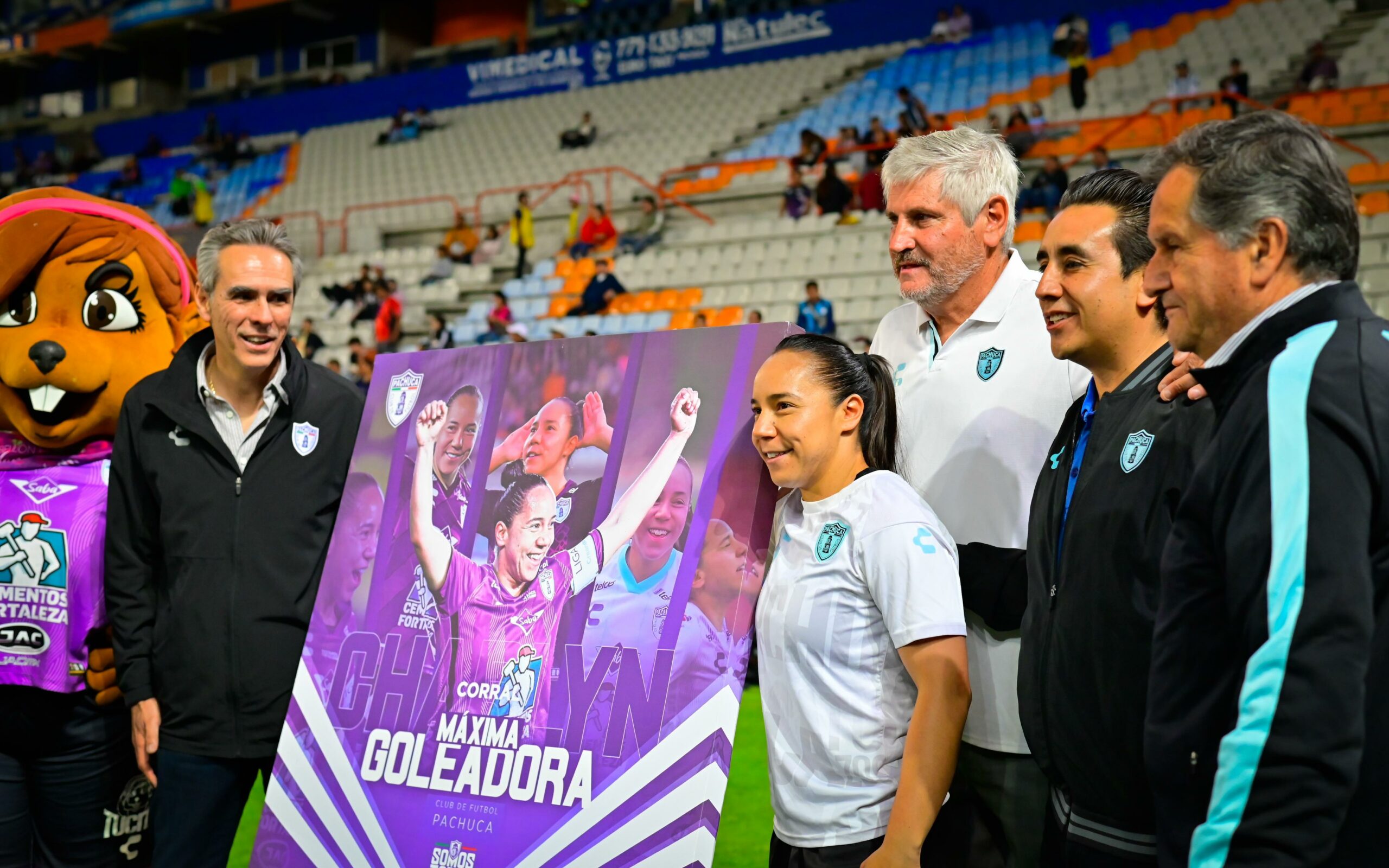 PACHUCA, HGO.- El homenaje a la Máxima Goleadora del Club de Futbol Pachuca debía quedar indeleble en la memoria de su casa, y es a partir de esta noche del 20 de mayo de 2024 que Charlyn Corral tiene un palco con su nombre en el Estadio Miguel Hidalgo de la ‘Bella Airosa, en reconocimiento tanto a su larga trayectoria deportiva, como a la gran labor que ha hecho desde su llegada a la institución convirtiendo 90 goles (con el de esta noche) en sus 3 años de permanencia con las Tuzas.