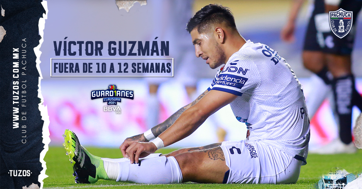 PACHUCA, HGO.- Previo al partido ante Guadalajara de la Jornada 7 del Guard1anes 2021, la Directiva del Club Pachuca informó mediante un comunicado de prensa que nuestro jugador Víctor Guzmán presentó una lesión meniscal y de cartílago en la rodilla izquierda que lo mantendrá fuera de actividad futbolística de 10 a 12 semanas aproximadamente, dependiendo de su evolución.